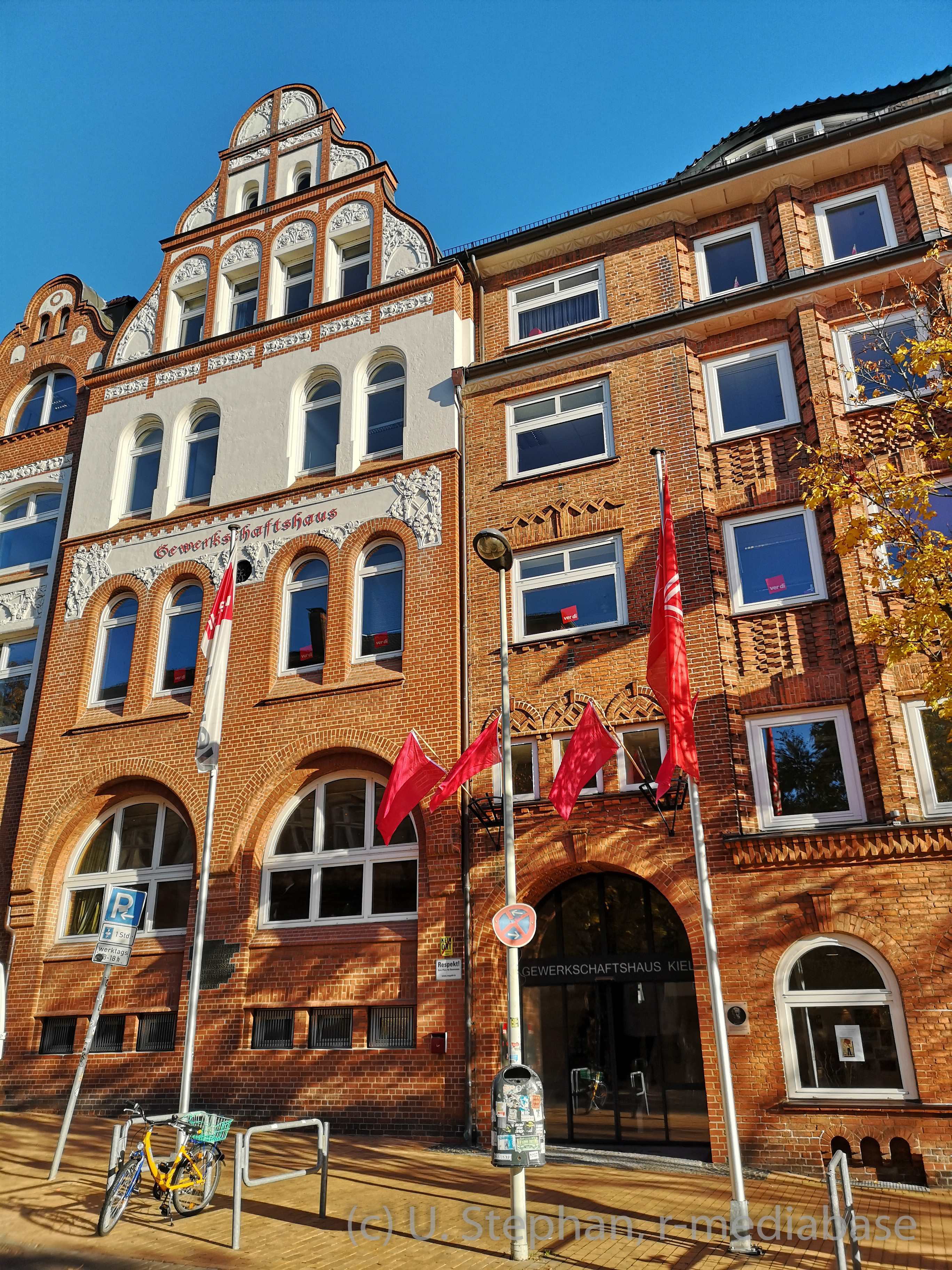 Beflaggtes Gewerkschaftshaus in Kiel