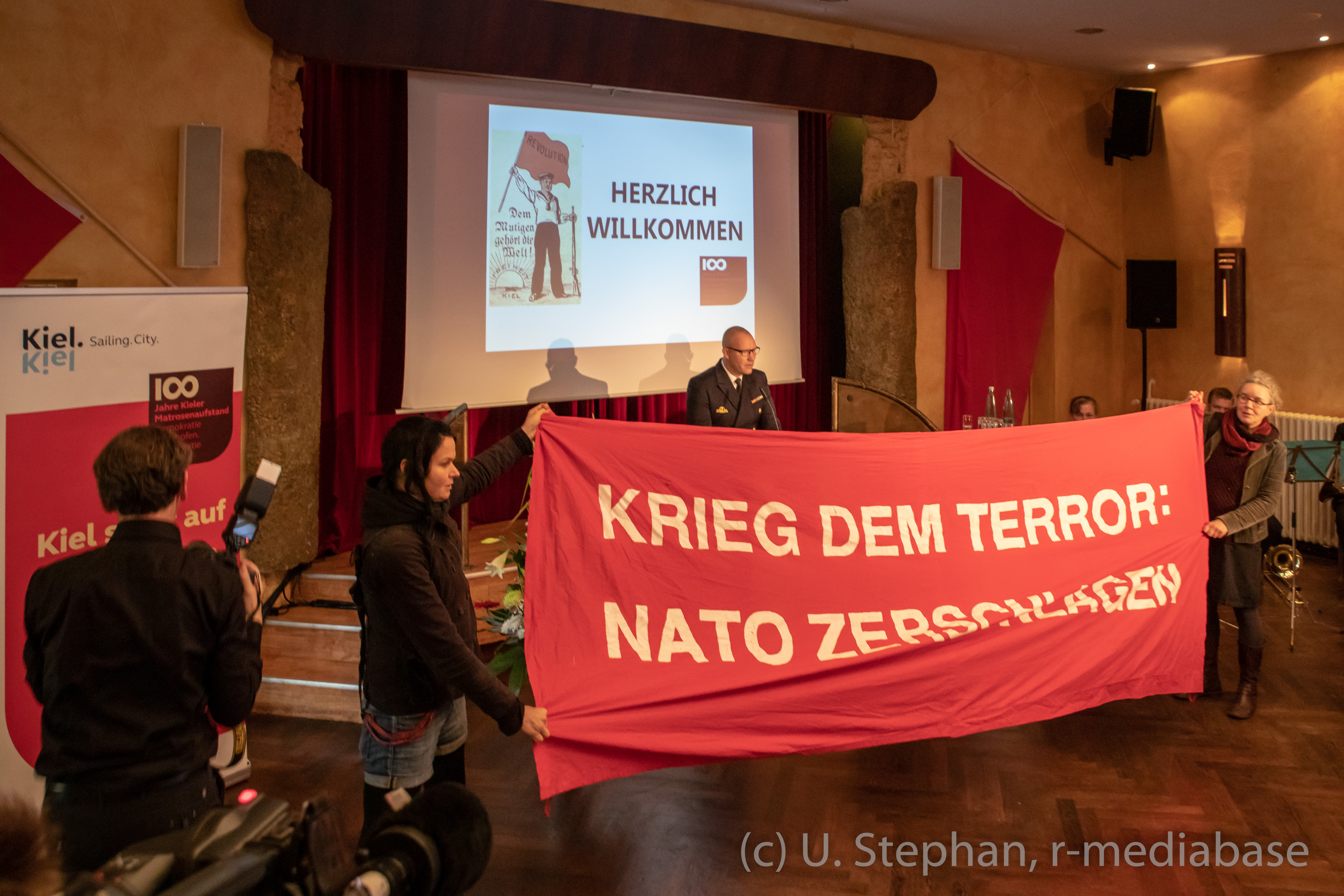 Offizieller Empfang der Stadt Kiel zum Matrosenaufstand im Legiensaal des Kieler Gewerkschaftshauses, Protest gegen den Auftritt eines Marineoffiziers auf der Veranstaltung im Gewerkschaftshaus
