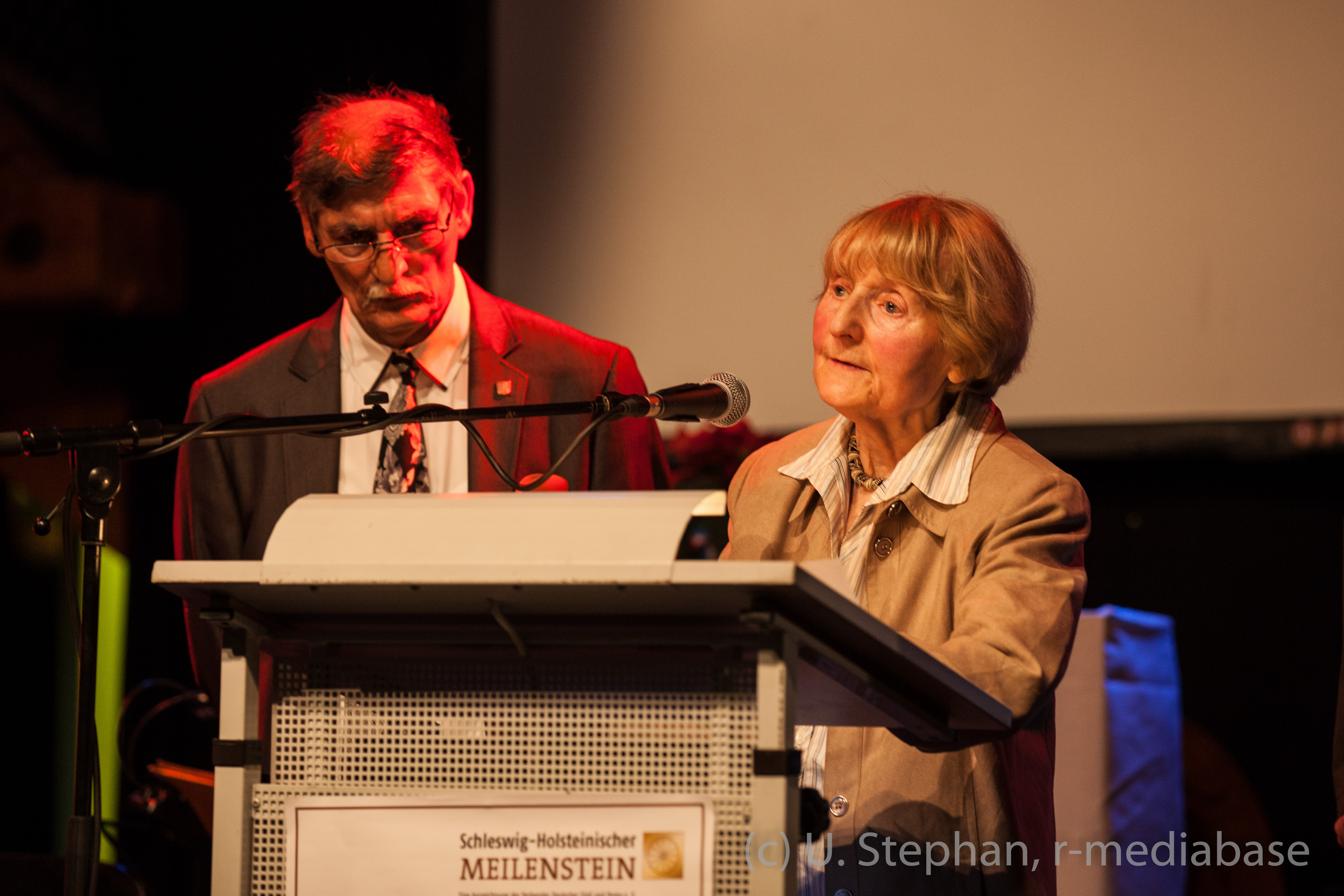Matthäus Weiss (Vors. d. LV der Sinti & Roma SH) und Marianne Wilke (Ehrenvorsitzender der VVN-BdA SH)