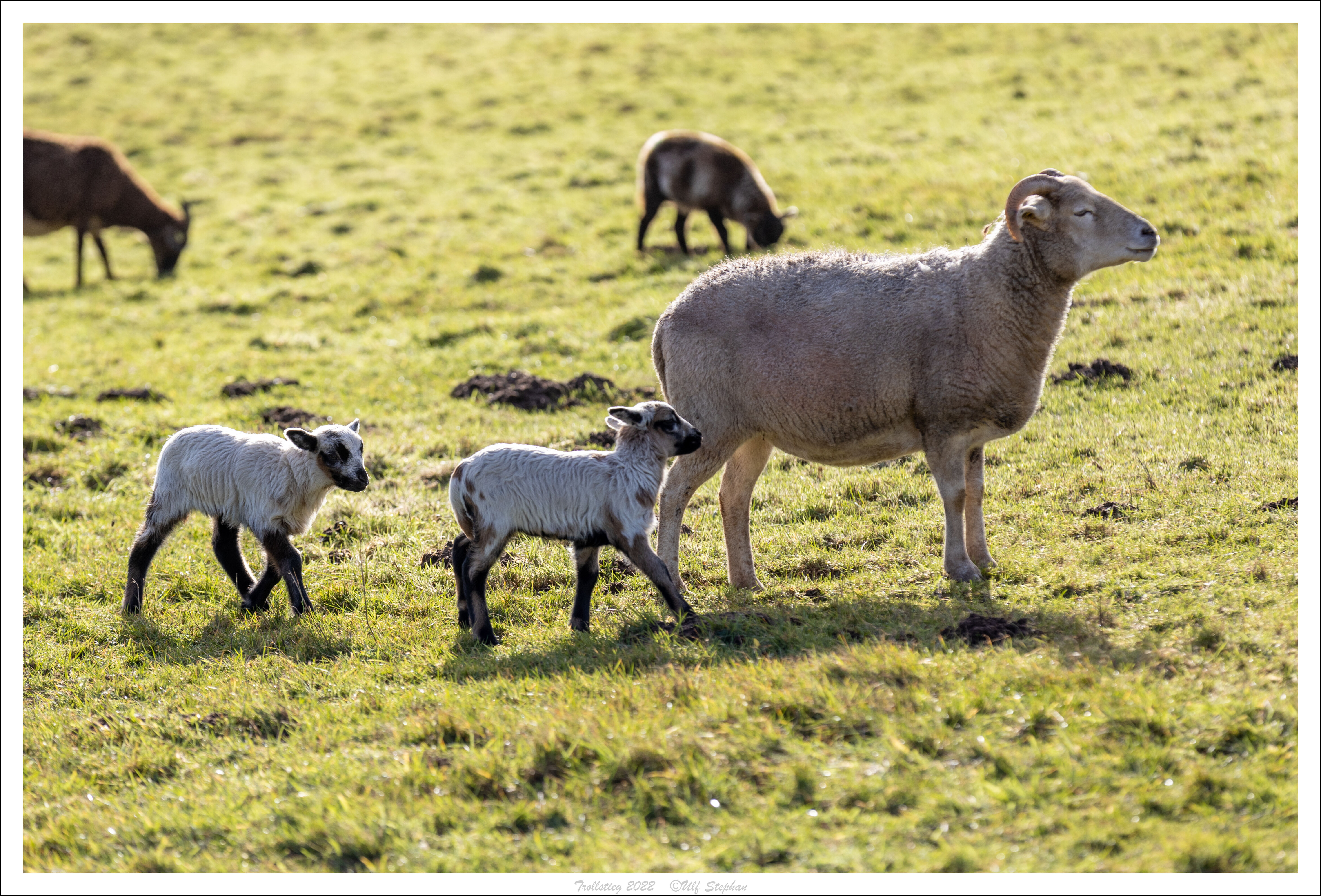 Eine Schafherde zum Abweiden auf den Koppeln des Trollstiegs. Und um die Jahreszeit zunehmend mit frischem Nachwuchs.